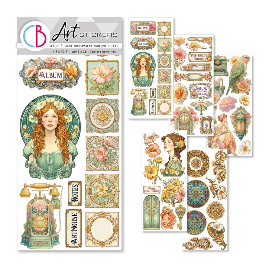 Pegatinas Artísticas: Más de 30 imágenes en hojas adhesivas transparentes sin cortar para crear collages, scrapbooking, tarjetas y manualidades con papel.