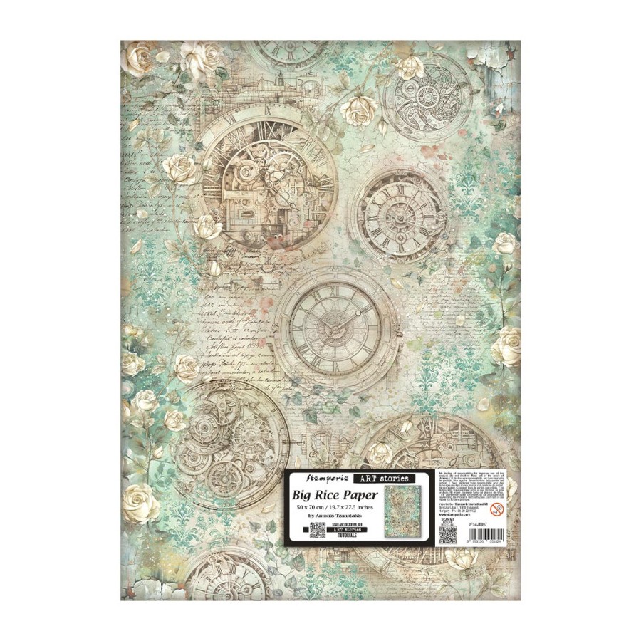 Papel de arroz decorado diseñado por Stamperia con un gramaje muy bajo cuya ligereza y adaptabilidad a casi cualquier superficie lo hace apto para cualquier técnica de decoupage. Permite forrar tanto por el interior como del exterior en superficies planas y redondas. Sobre el cristal es posible mantener la transparencia, sobre tela mantener la suavidad y sobre el mobiliario permite decorar el forro interior. Incluye una ilustracion de una esfera de reloj con rosas rosas.