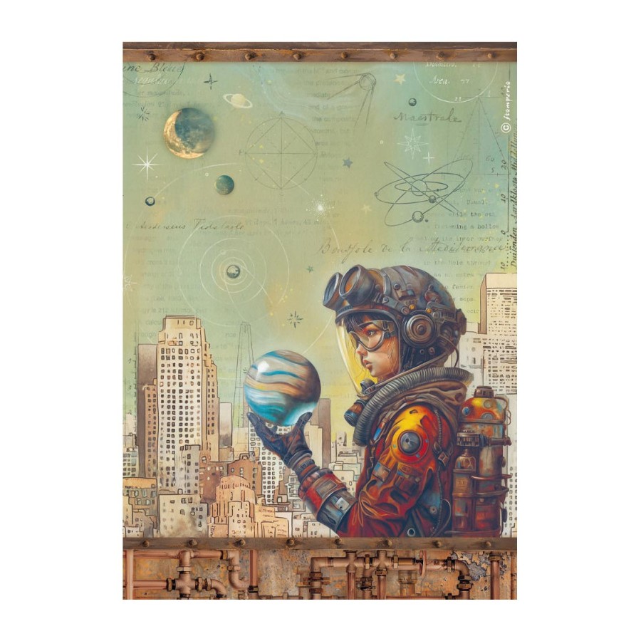 Papel de arroz decorado diseñado por Stamperia con un gramaje muy bajo cuya ligereza y adaptabilidad a casi cualquier superficie lo hace apto para cualquier técnica de decoupage. Permite forrar tanto por el interior como del exterior en superficies planas y redondas. Sobre el cristal es posible mantener la transparencia, sobre tela mantener la suavidad y sobre el mobiliario permite decorar el forro interior. Incluye una ilustracion de una esfera de reloj  con rosas rosas.