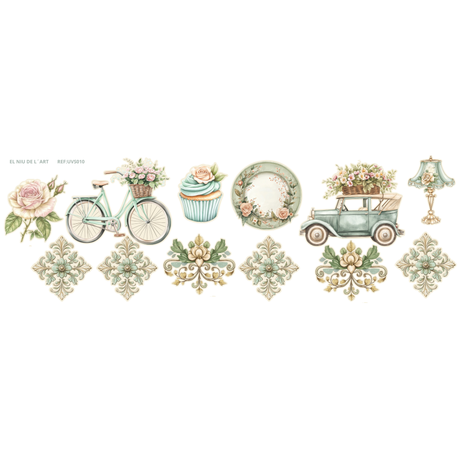 Transfers UV especialmente diseñados para pegar en papel y cartón, para tus proyectos de scrapbook, solo tienes que presionar un poco y retirar la pelicular protectora. trasnfers con relieve y brillo