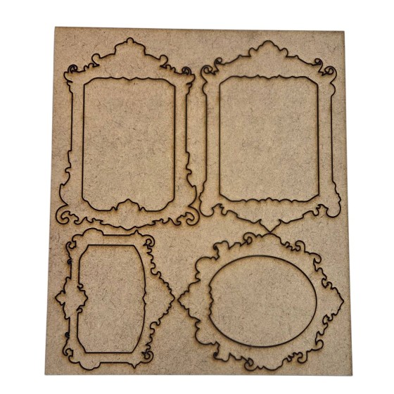 El conjunto se compone de 3 piezas de madera dm y una pieza de acetato. Formando una pieza de 6,3mm de grosor, con un hueco de 2mm para introducir los elementos decorativos.